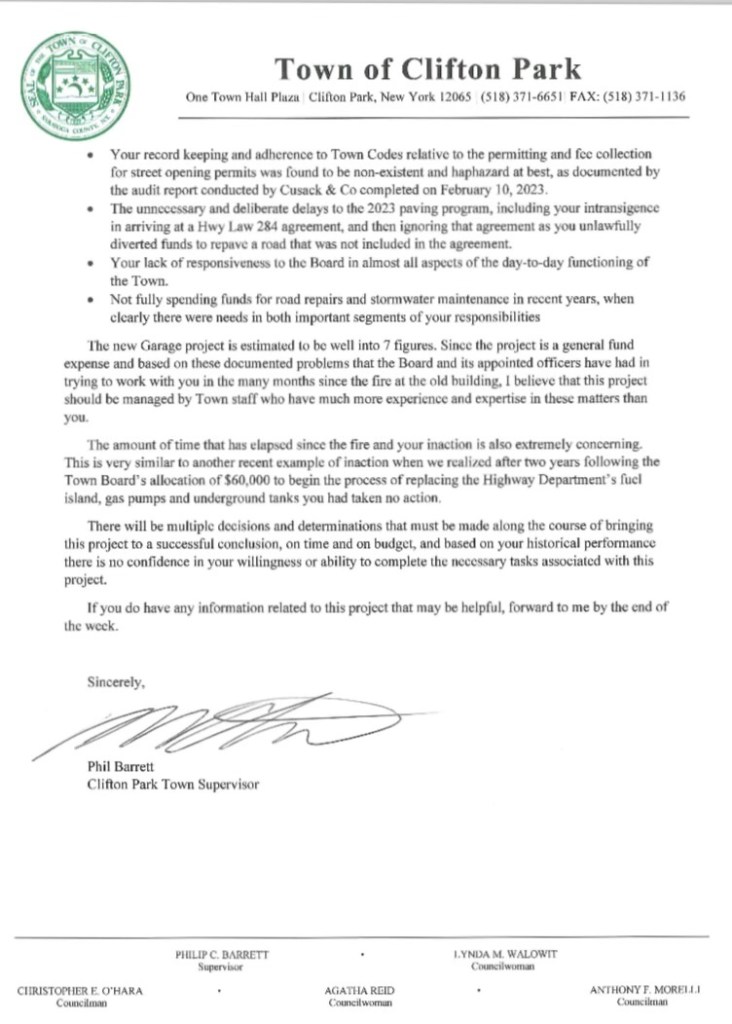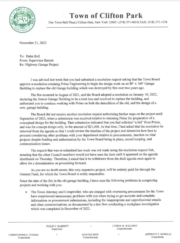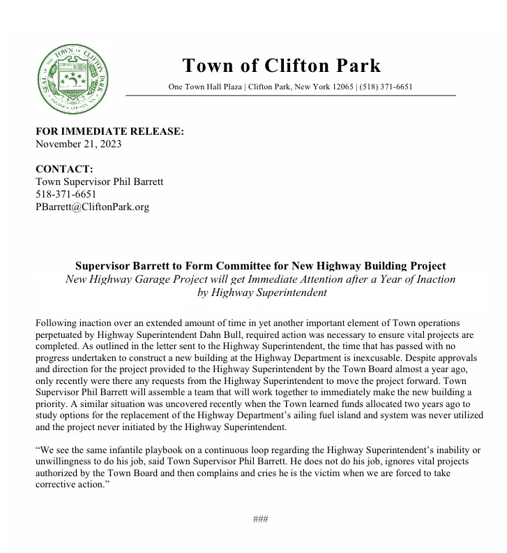 Another complete failure of the Clifton Park Highway Superintendent to do his job has led to my needing to take action make a project to plan and construct a new Highway Garage a priority. This has been a repetitive theme and further evidence this is an elected official who is unwilling or unable to perform the basic responsibilities of his position. The information included in this post are the initial letter sent to the Highway Superintendent that includes details and a timeline of the failed process to date of building a new garage. At the end of the letter, I requested any information that may be available about the project. This letter was answered with the usual response–a press release. Therefore, I later issued a press release as well. In familiar fashion, a project or responsibility of the Highway Superintendent languishes without progress and further time is wasted as he attempts to obscure his failures and grab the vacuous attention he craves. I have assembled a committee of professionals that lead various departments in Town Government, who have experience and expertise in areas of importance to planning and building a new Highway Garage. More importantly, our focus will be completing the task in a timely manner and not instigating false controversies, trying to bring attention to ourselves and wasting staff time with useless resolution requests devoid of necessary information.