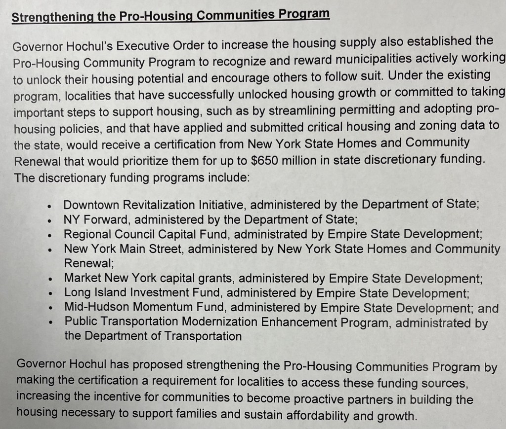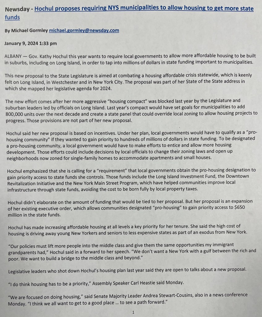 Yesterday I wrote about concerns with future housing proposals as it relates to state government policies. Below is an interesting article from Michael Gormley of Newsday about the proposals, where he references some of the most concerning options that are being considered. Also below is an excerpt from the State of the State information that speaks to the grant funding element of this issue.